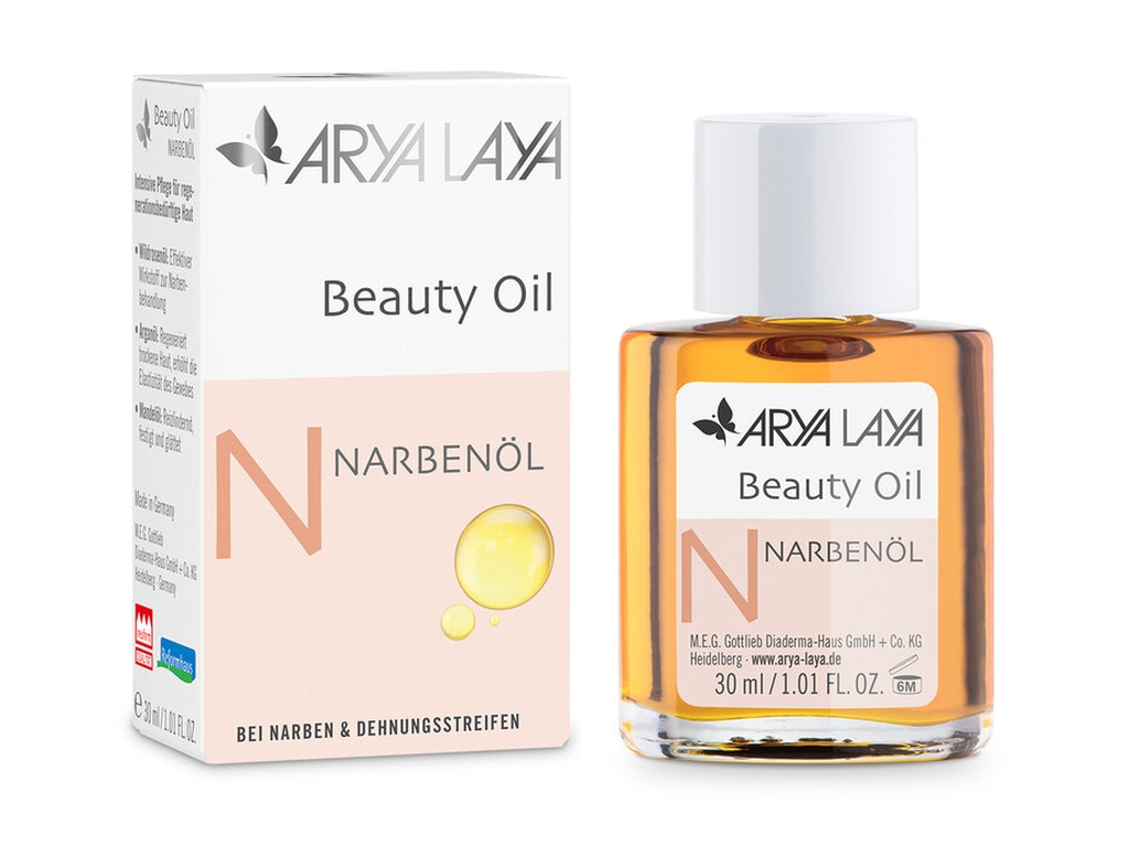 Arya Laya Beauty Oil Narbenöl ist das Ergebnis von mehr als 110 Jahren Erfahrung in der Herstellung hochwertiger Naturkosmetik. Es wurde speziell für die Verbesserung des Erscheinungsbildes von Narben und Dehnungsstreifen entwickelt. Die ausgewogene Kombination kostbarer Pflanzenöle wie Wildrose-, Argan- und Weizenkeimöl glättet und beruhigt die Haut, fördert die Elastizität des Bindegewebes und strafft das Gewebe. Ungleichmäßige Hauttönung und Pigmentflecken werden gemindert. Dank der Dreifach-Wirkung wird beanspruchte, trockene und reife Haut intensiv regeneriert und seidenweich gepflegt. Die besonders leichte Rezeptur, mit ihrem hohen Gehalt an essentiellen Fettsäuren, zieht schnell ein, ohne Rückstände zu hinterlassen.