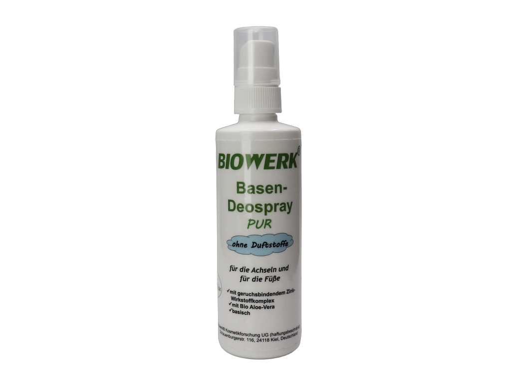 Der pH-Wert des Biowerk® Basen-Deosprays ist basisch. Die Base kann den sauren Schweiß neutralisieren. Die Vermehrung der Schweißgeruch produzierenden Bakterien kann durch das von dem Basen-Deospray erzeugte basische Milieu verringert werden.