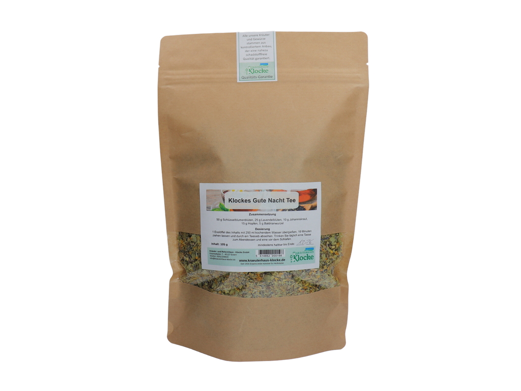 Klockes Gute-Nacht Tee – unsere bewährte, sorgsam zusammengestellte Teemischung mit 5 erlesenen Kräutern.